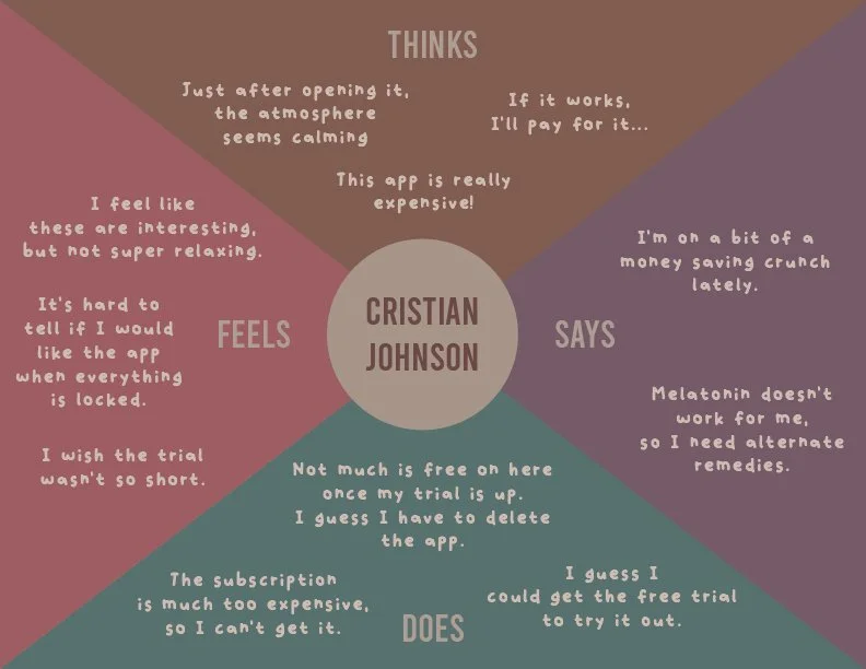 Next, to visualize Calm’s average user, I created a persona, Christian. I then created an empathy map to see what Christian might be saying, feeling, thinking, or doing before, during, and after using the Calm app.